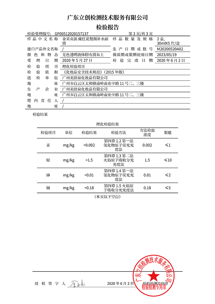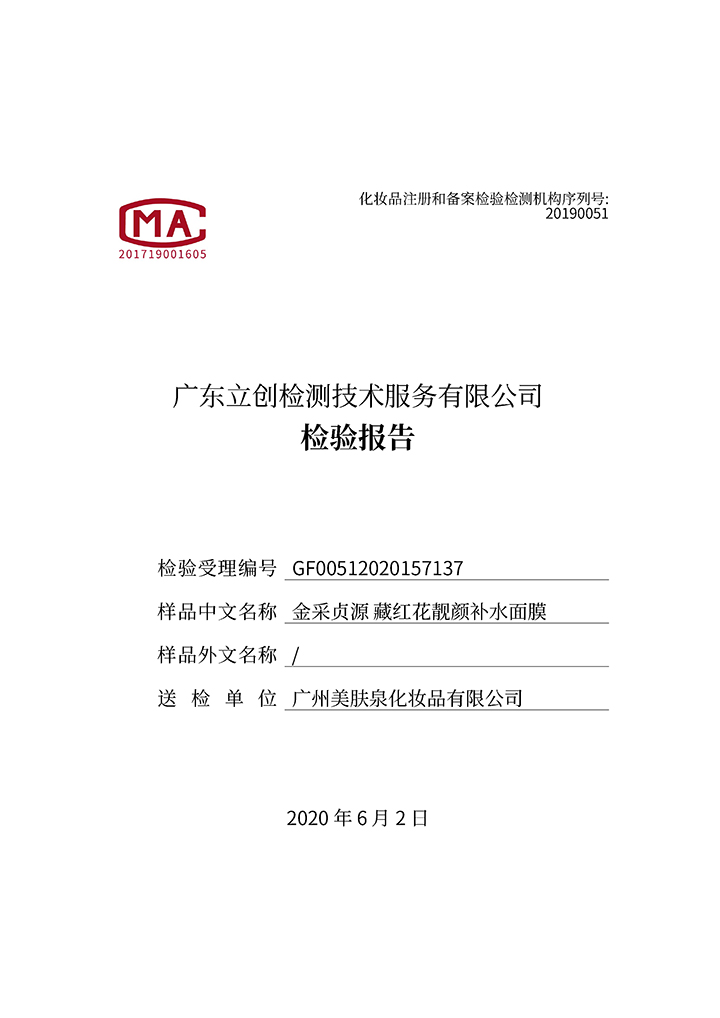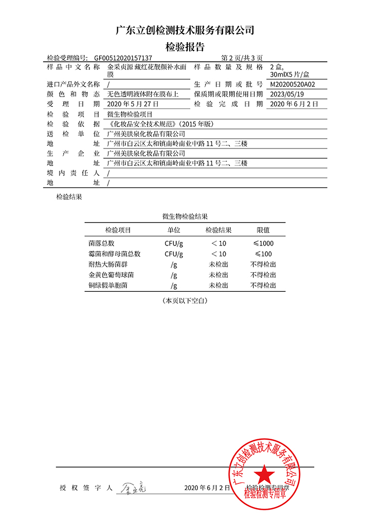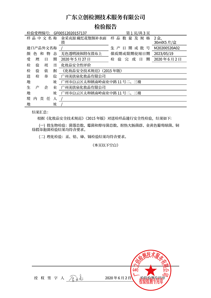 藏紅花靚顏補(bǔ)水面膜檢驗(yàn)報(bào)告
