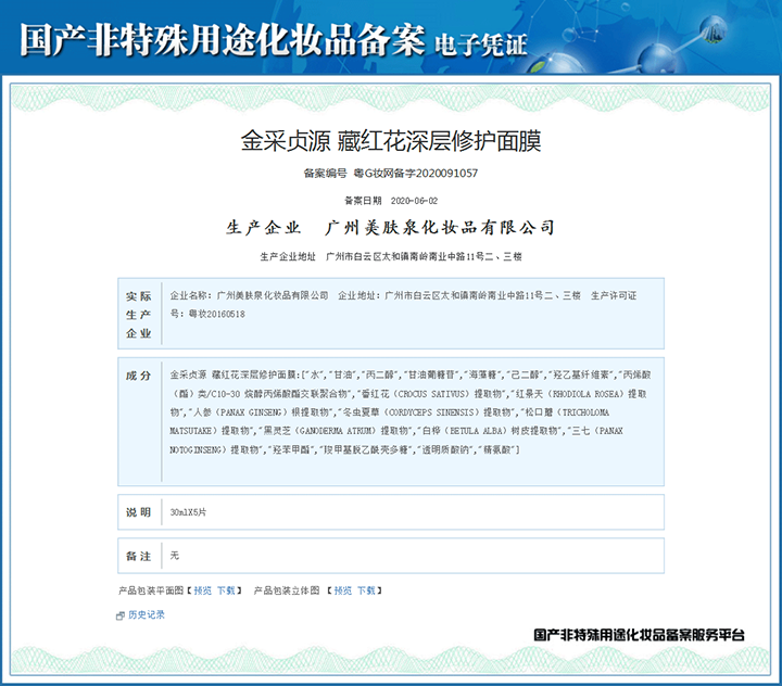 藏紅花深層修護(hù)面膜備案憑證